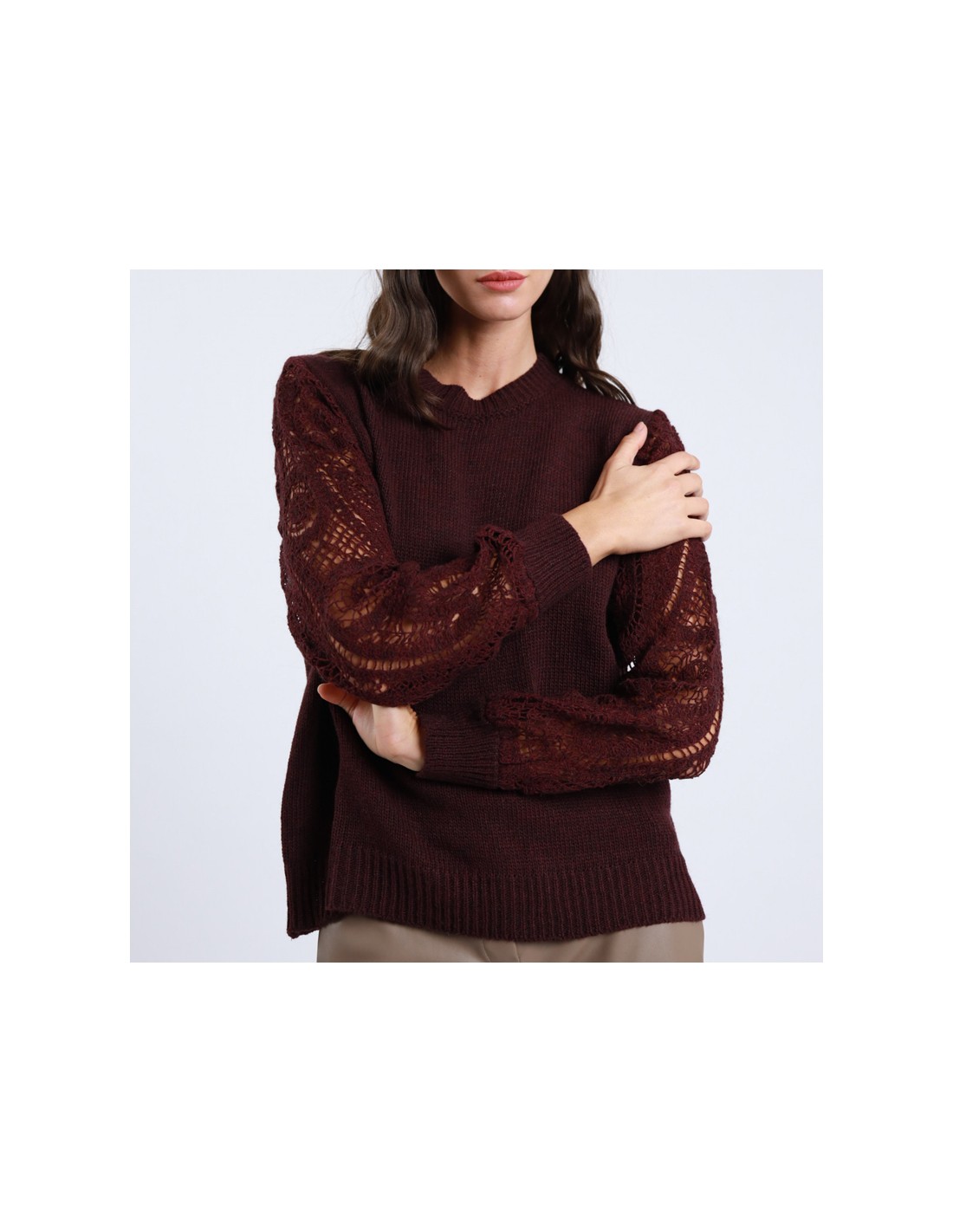 Maglia Girocollo con Maniche Traforate in Crochet e Orli a Costine.