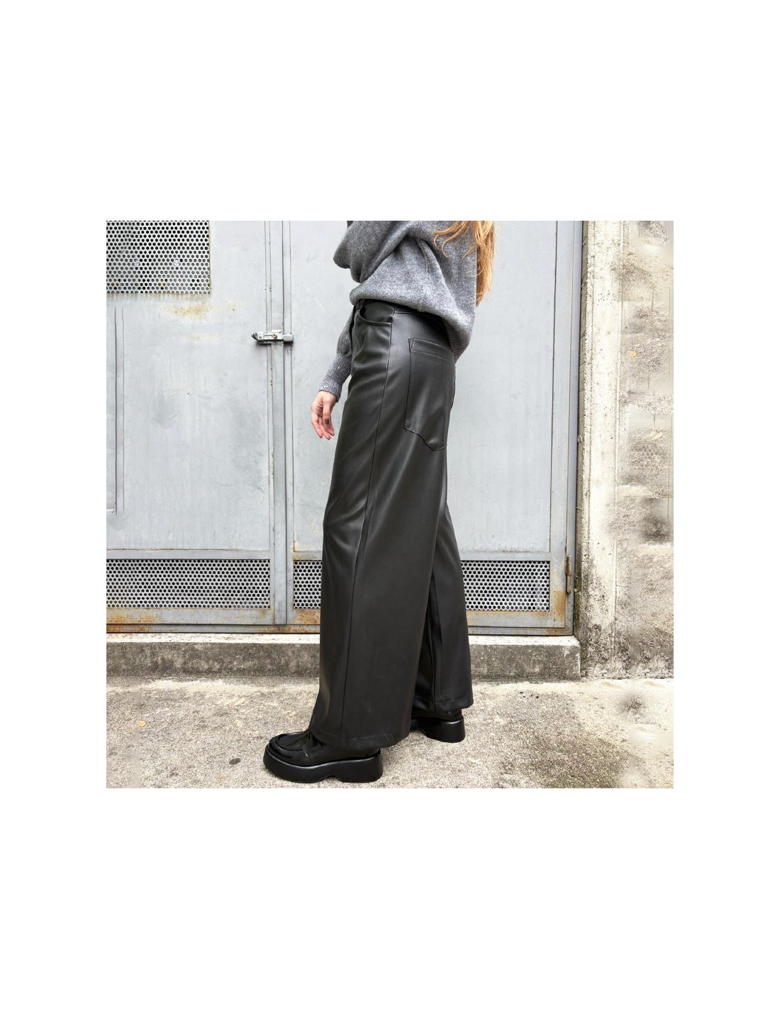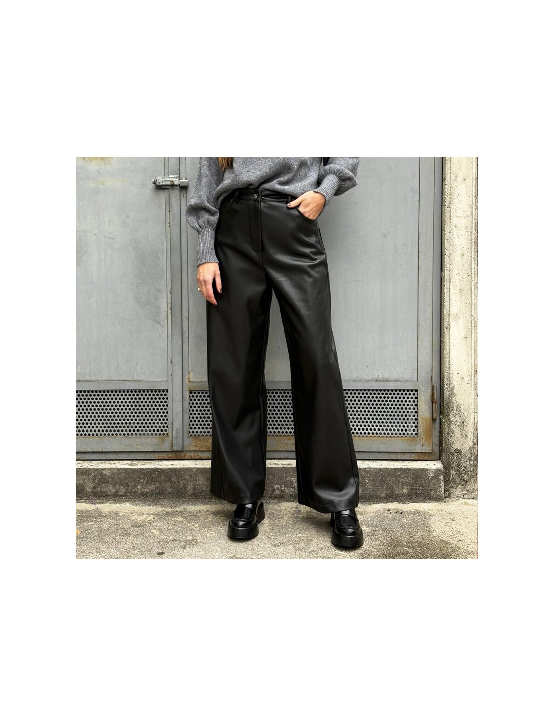 Pantalone palazzo Susymix in ecopelle nero. Chiusura con bottone, due tasche frontali e due tasconi sul retro. Vestibilità regolare.