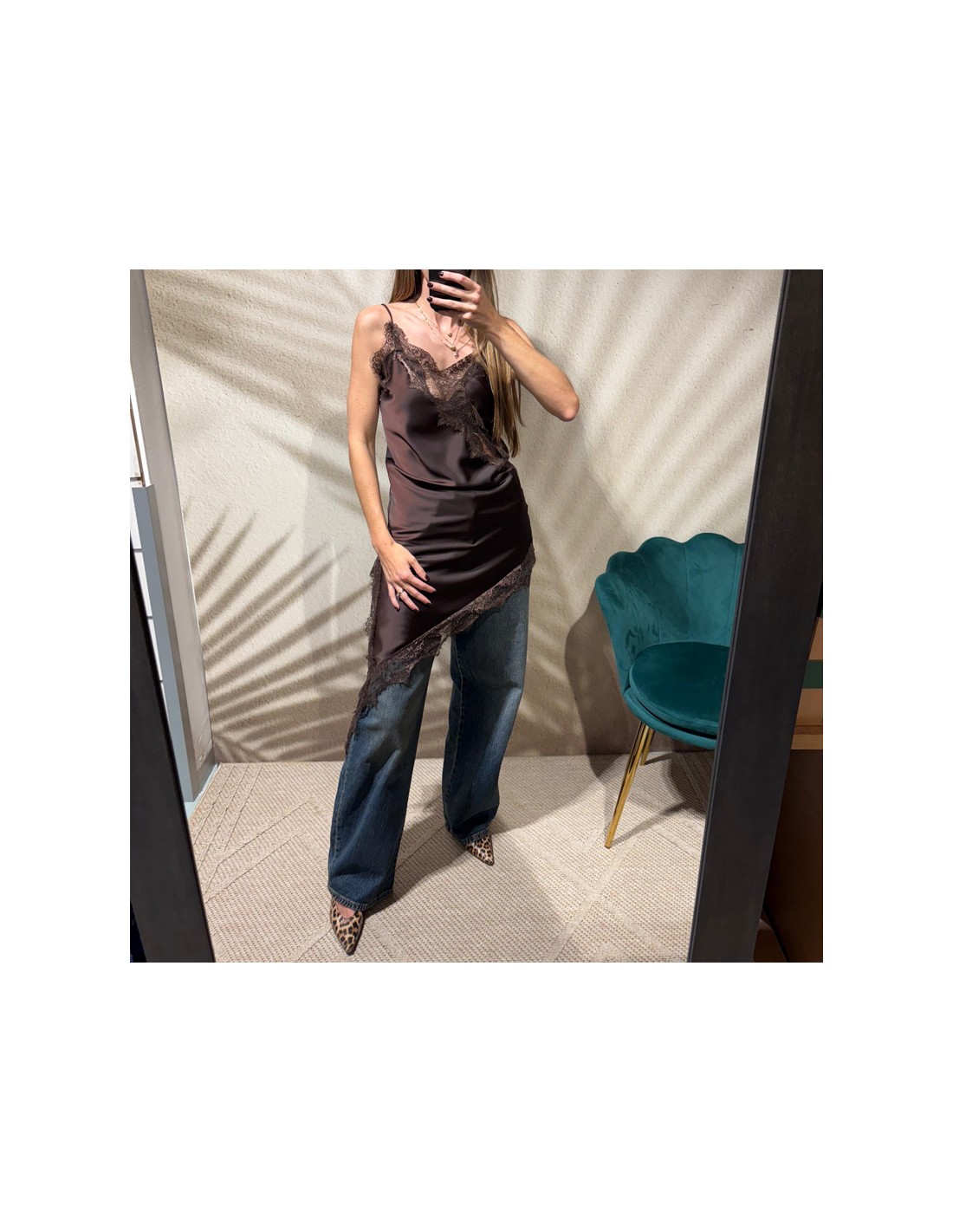 Abito/sottoveste in tessuto lucido con inserti in pizzo in tono