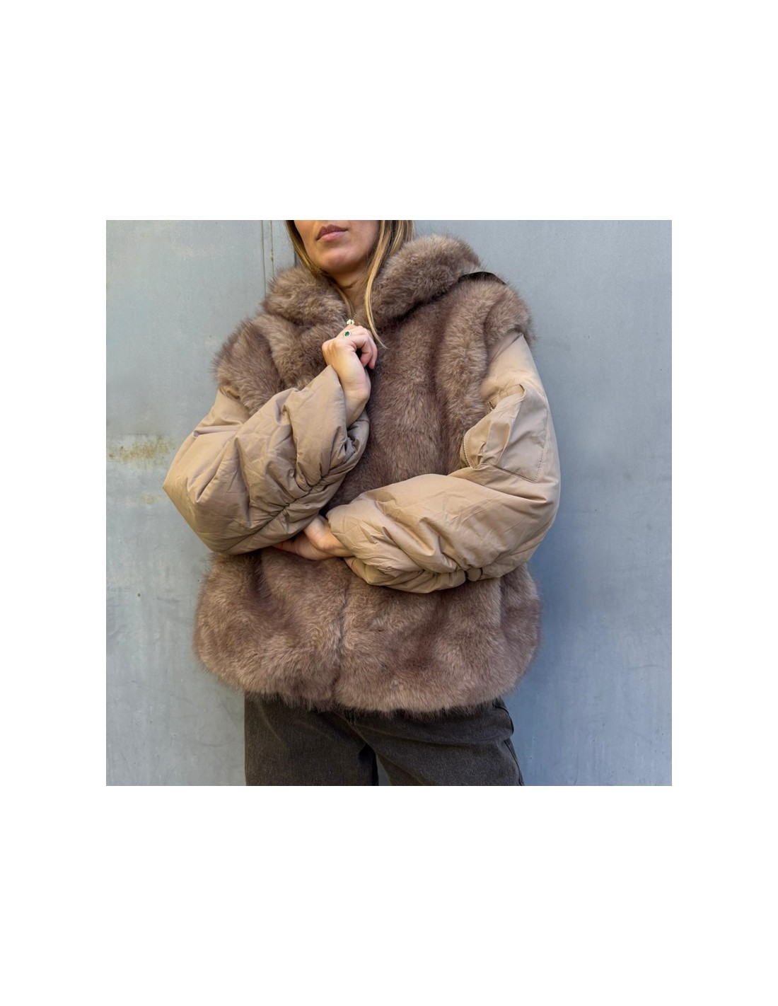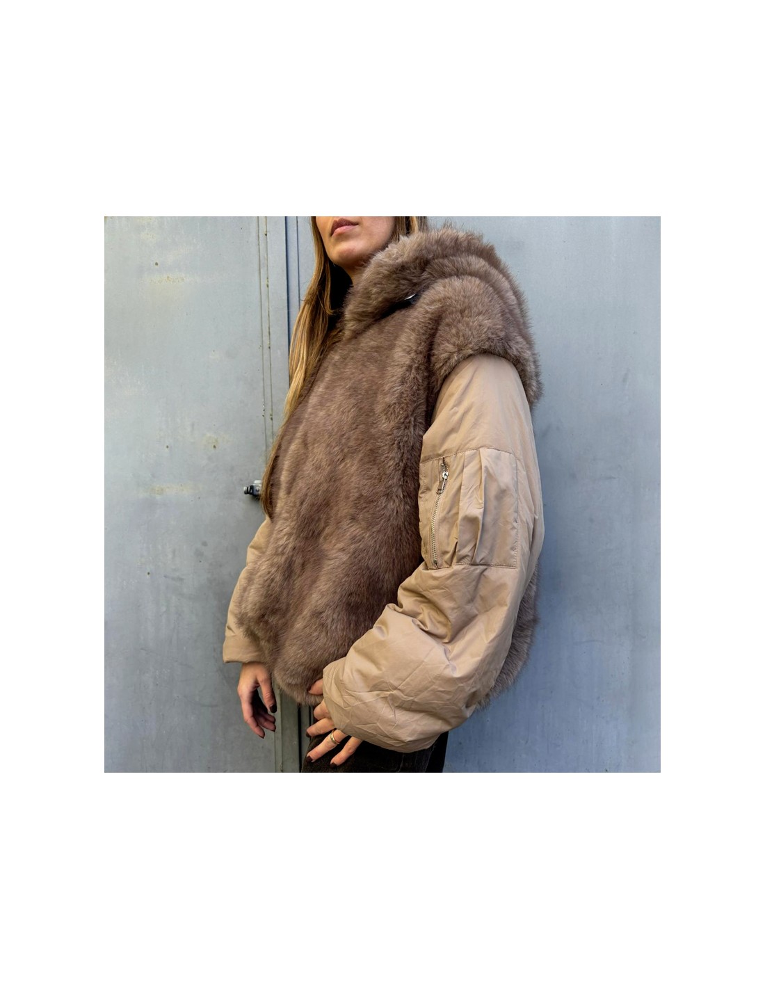 Piumino con insertoin ecopelliccia in tono. Dotato di tasche e cappuccio, vestibilità over, Cerniera sulla manica.
