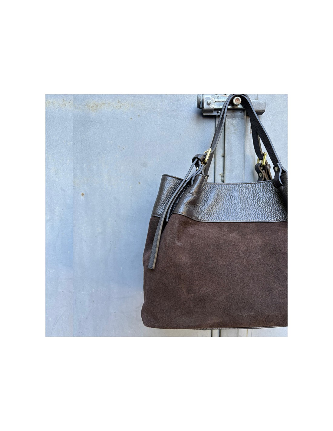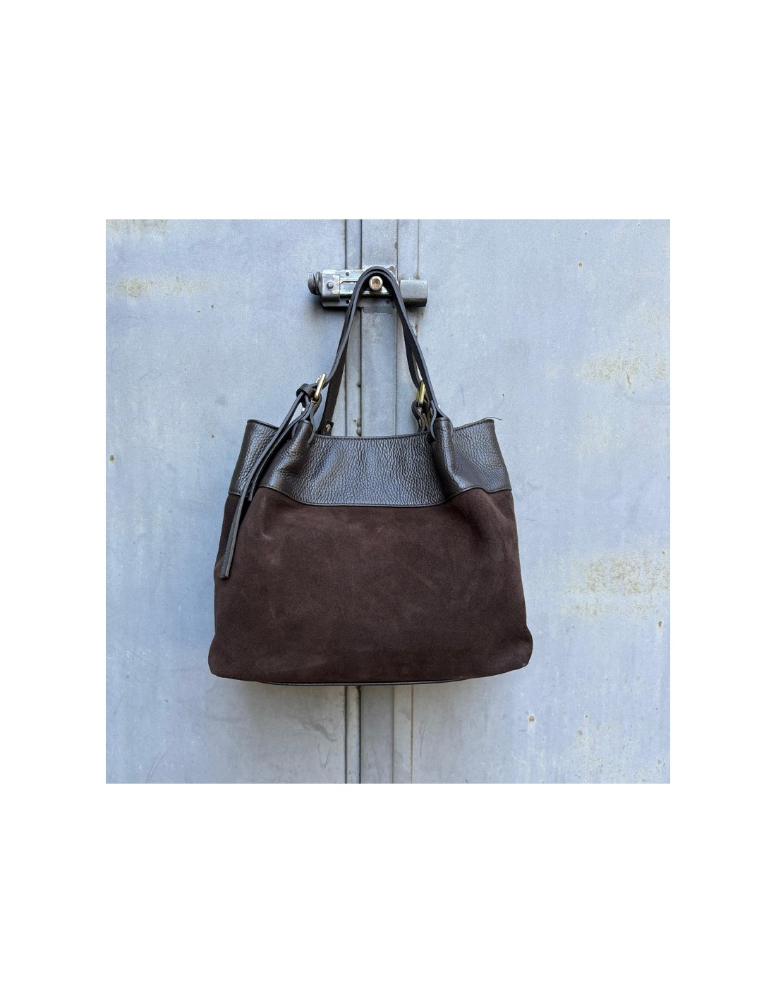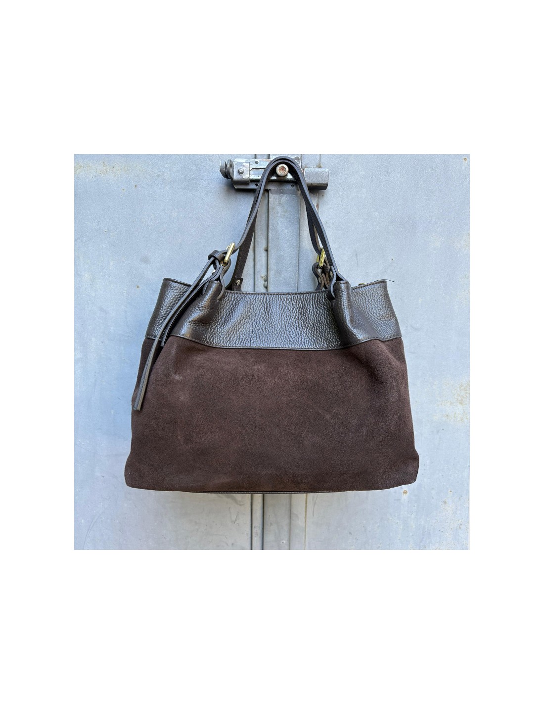 Borsa in vera pelle scamosciata con dettaglio riporto in pelle dollaro in tinta. Doppio manico con fibbia allungabile. Tracolla in pelle inclusa.