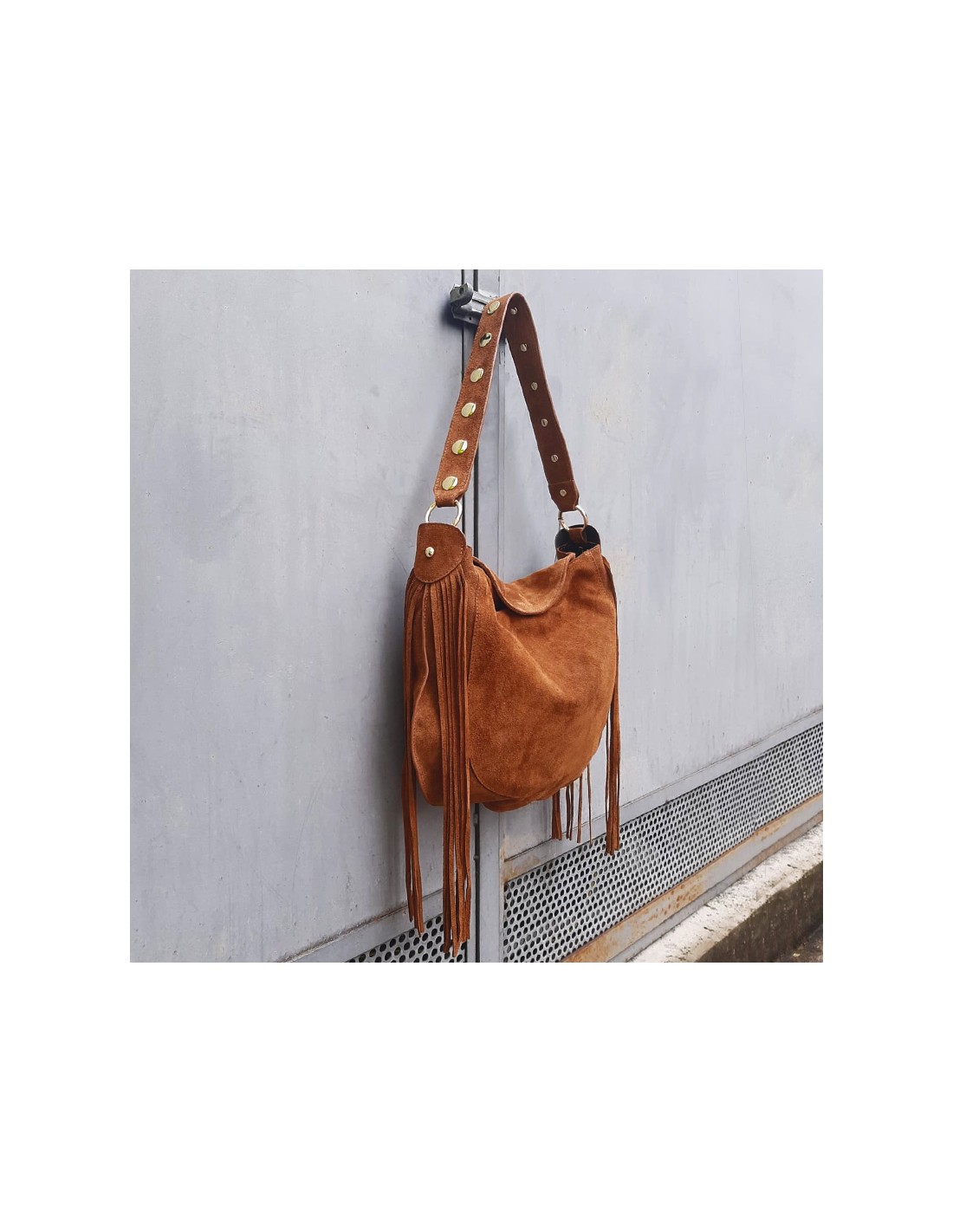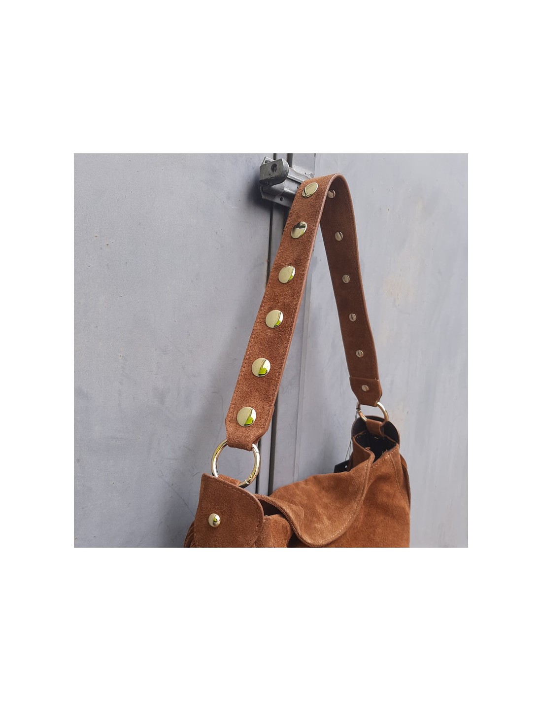 Dotata di manico fisso con borchie dorate, tracolla removibile e regolabile.
