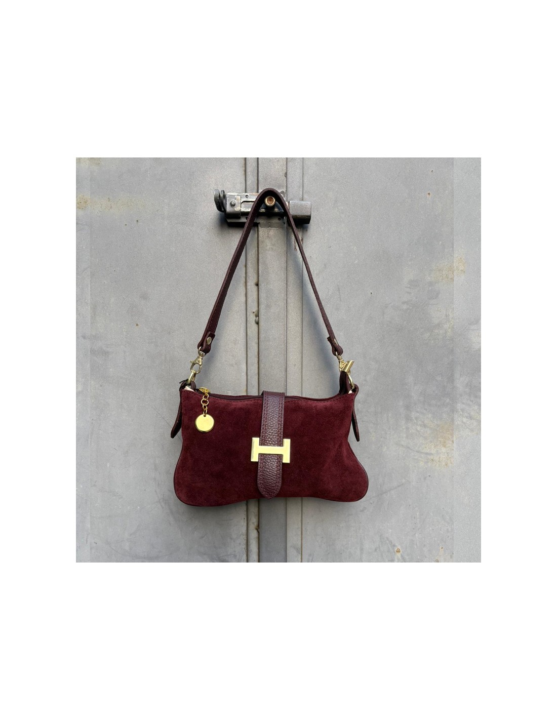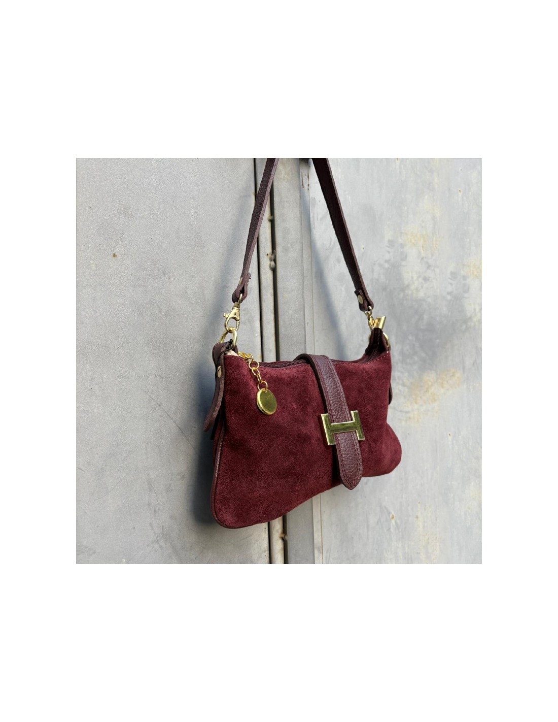Borsetta pochette in vera pelle scamosciata con inserti in dollaro colore bordeaux.