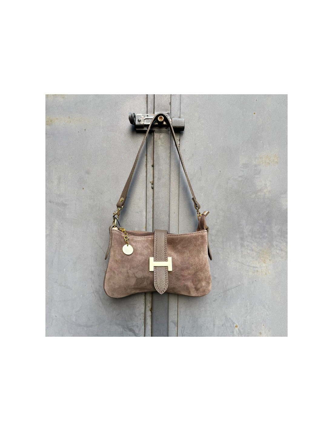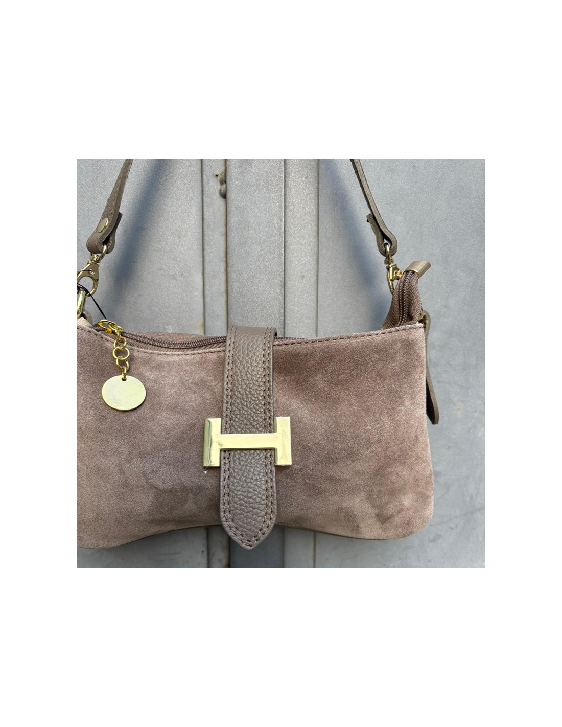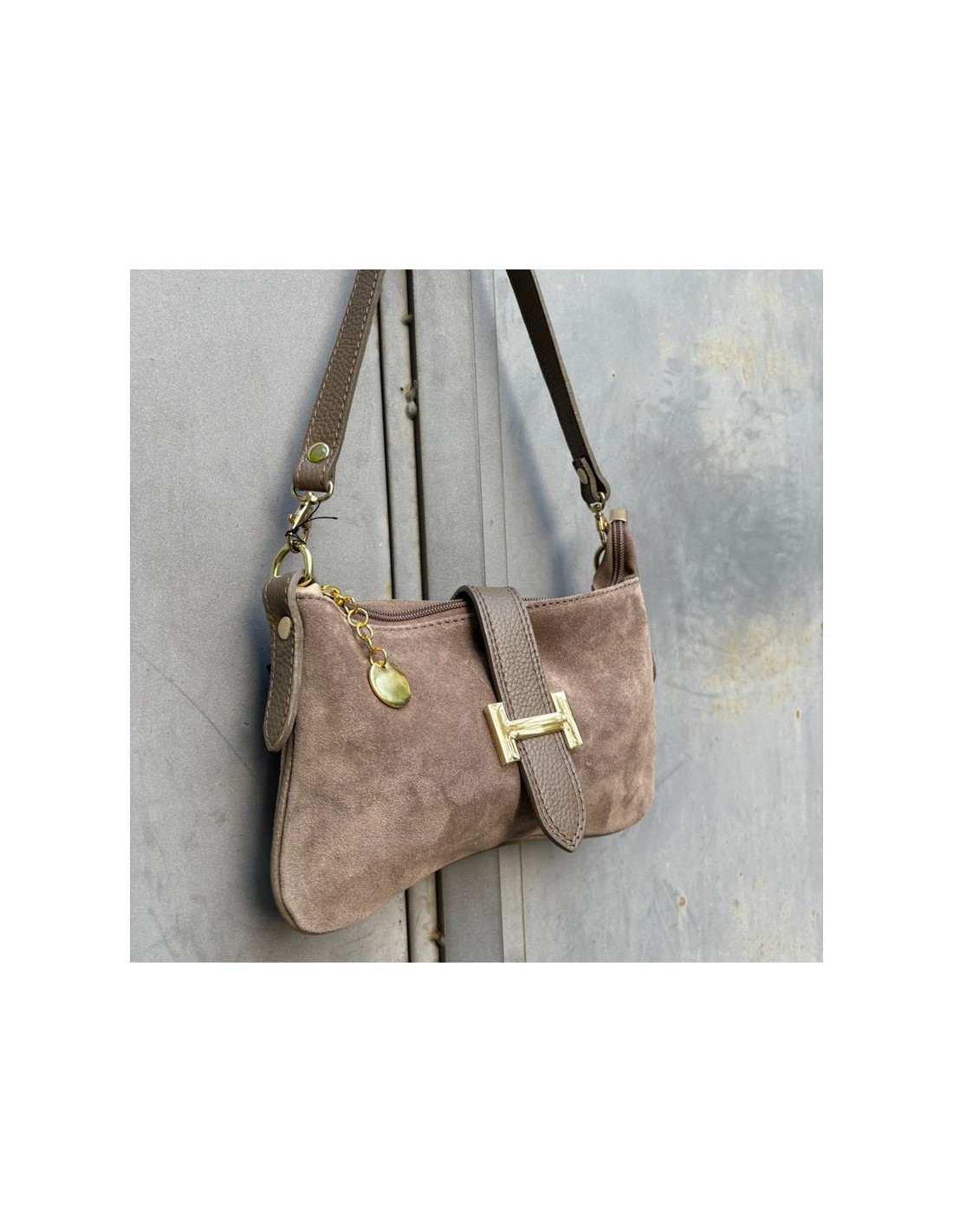 Borsetta pochette in vera pelle scamosciata con inserti in dollaro colore FANGO.