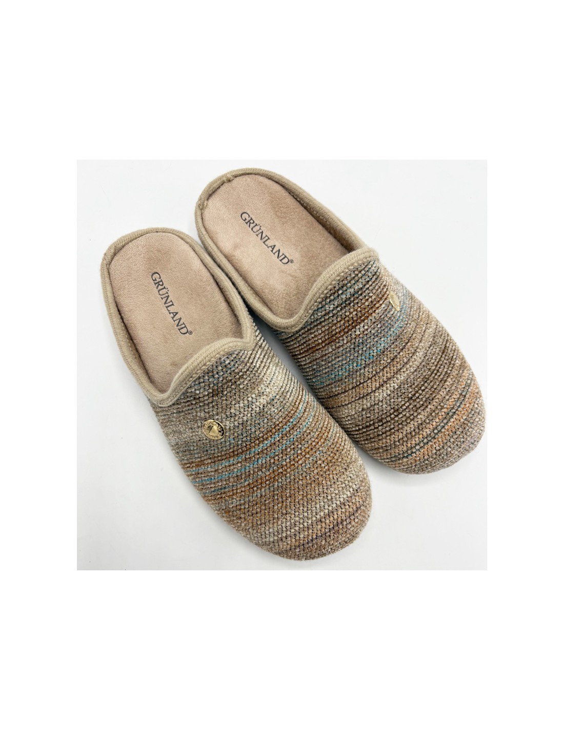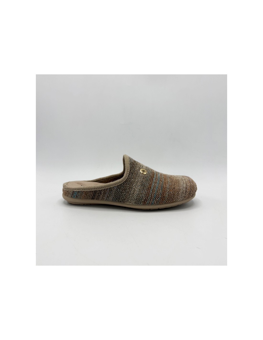 Ciabatta felpata con trama colorata su base beige e melange di colori. Suola in gomma antiscivolo, leggermente rialzata sul retro.