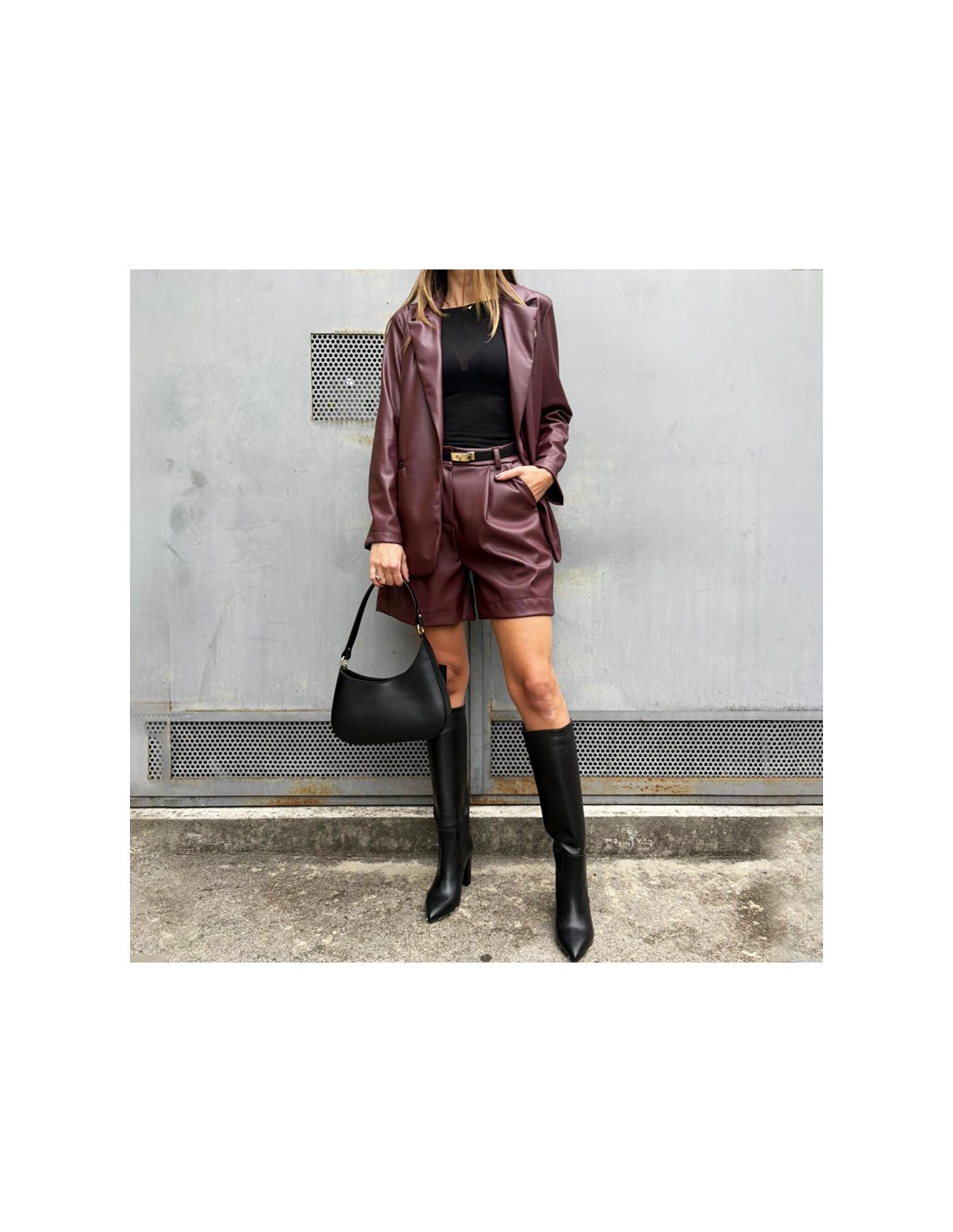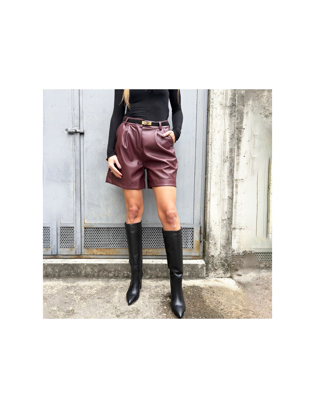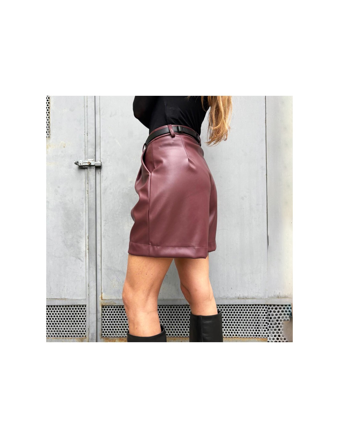 Shorts in ecopelle bordeaux di lunghezza media, vestibilità morbida, chiusura con bottone e cerniera. Pence e doppia tasca sul davanti.