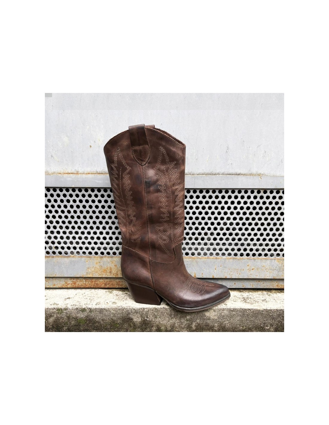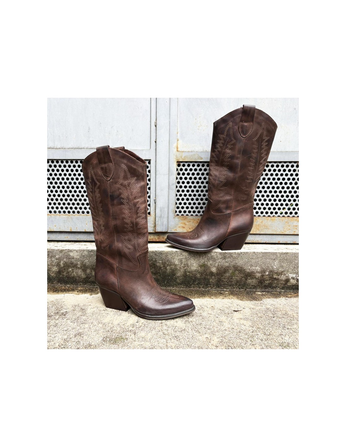 Stivale texano made in Italy in vera pelle. Pellame nubuck ingrassato, effetto invecchiato testa di moro con impunture.